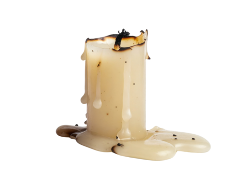 An extinguished white candle with a burnt, blackened wick. Melted wax has dripped down its side and pooled at the base, showing signs of use.