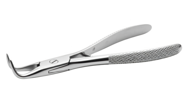 Polished metal dental extraction forceps with textured handle against black background tool instrument
