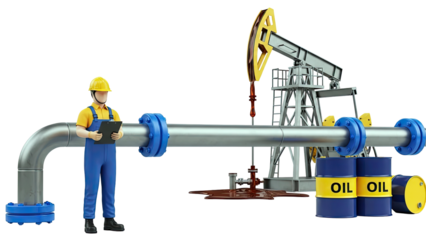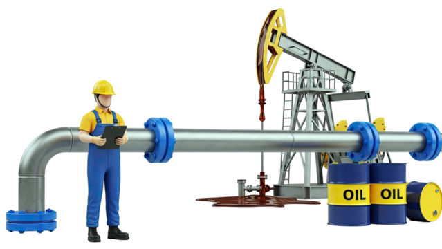 Oil Industry Scene with Worker, Pumpjack, Pipeline, and Barrels