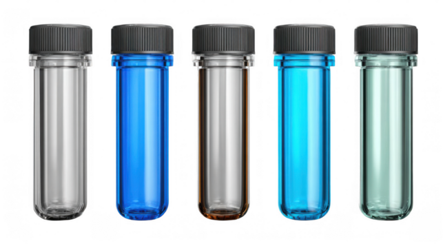 Seven colorful centrifuge tubes, filled with various liquid samples, are arranged in a row against a transparent background, ready for scientific analysis