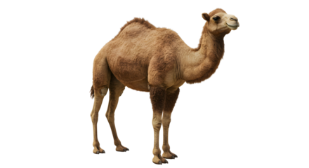 Tan dromedary camel with single hump standing in right-facing profile view position, isolated on a transparent background