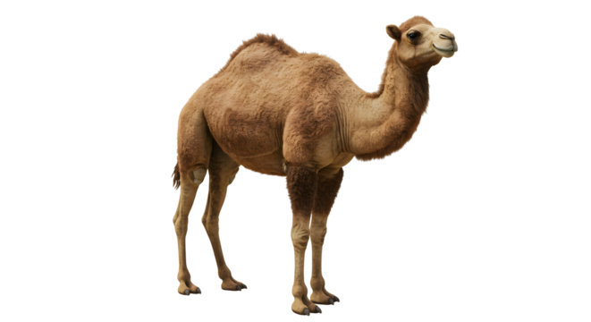 Camel with Large Hump and Light Brown Coat Standing in Isolated White Background