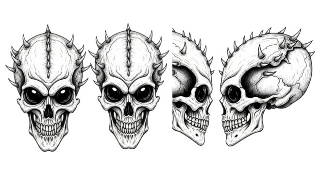 Four detailed alien skulls with spiky cranial protrusions and empty eye sockets isolated on transparent background