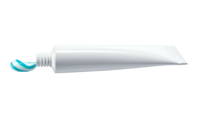 A close-up view of a partially squeezed, white cylindrical tube with a blue-and-white paste extruded onto a black background
