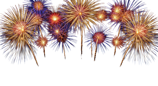 Spectacular multi-stage fireworks burst in golden, orange, blue & purple, creating intricate patterns against a dark night sky with copy space below, grand festive atmosphere