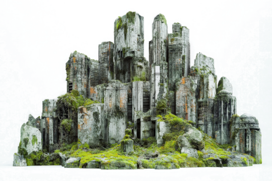 a large rock formation with a green moss covered rock cutout and isolated on transparent background