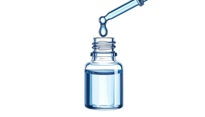 Dropper dispensing liquid into small glass bottle, clear and blue