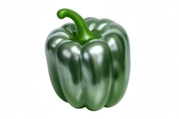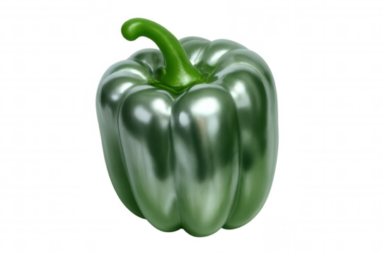 Close-up of a metallic, shiny green bell pepper isolated on a transparent background, creating a vibrant and eye-catching visual