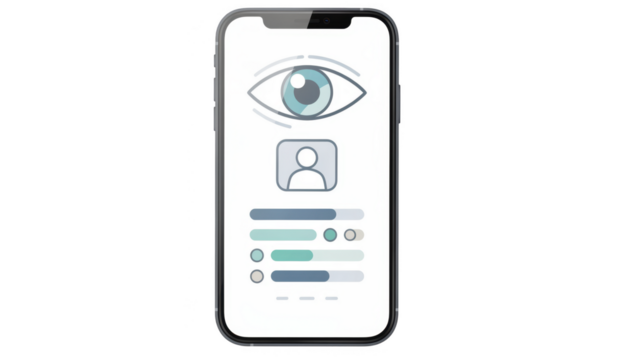 Closeup of a smartphone icon for an eye alignment home monitoring app highlighting remote review features and daily symptom logs against a stark white background.