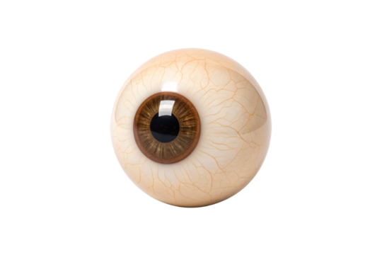 Detailed anatomical human eyeball model with brown iris and visible blood vessel networks, isolated on a transparent background