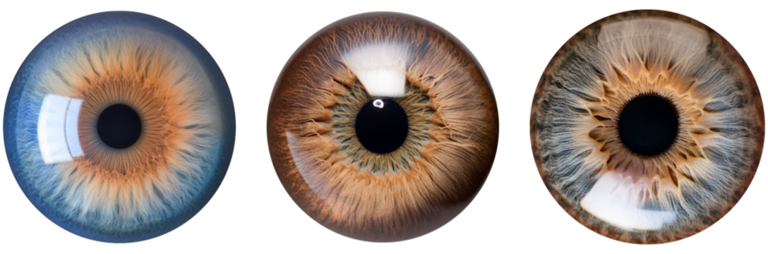 Assorted human eyes, featuring different iris colors and detailed reflections, isolated on a white background