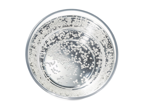 Effervescent circular bubbles rising in sparkling clear water in glass viewed from above and eye level