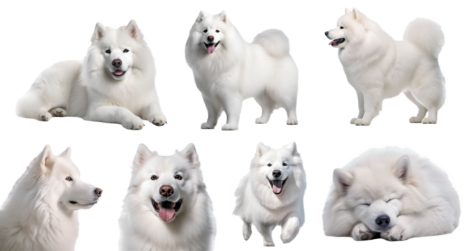Samoyed dog puppy, many angles and view portrait side back head shot running isolated on transparent background cutout, PNG file