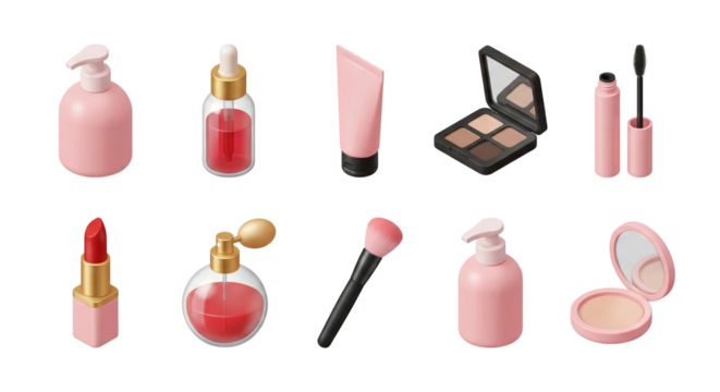 Elegant collection of pastel cosmetic and makeup tools isolated on a transparent background for