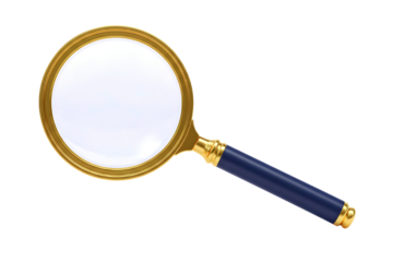 A classic magnifying glass with a polished gold and black handle resting against a transparent background, symbolizing investigation and scrutiny in various contexts