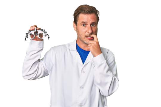 A middle-aged optometrist man biting fingernails, nervous and very anxious.