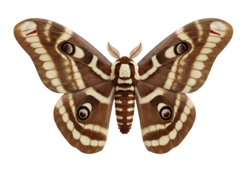 Giant silk moth isolated PNG on transparent background, brown and beige butterfly with eye spots for design and educational use