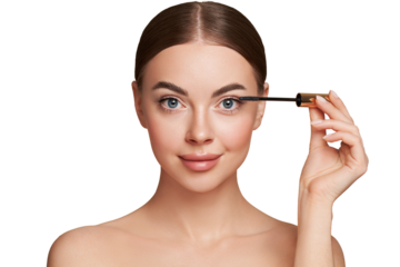 Beauty woman applying black mascara on eyelashes with makeup brush. Eyelash extensions. makeup, cosmetics. beauty, skincare
