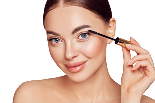 Beauty woman applying black mascara on eyelashes with makeup brush. Eyelash extensions. makeup, cosmetics. beauty, skincare