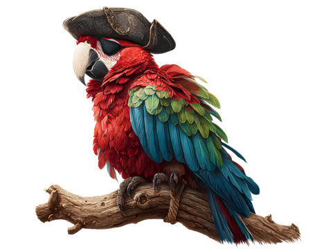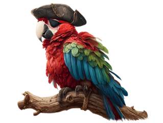 Colorful Pirate Parrot Wearing Tricorn Hat and Eye Patch, Perched on Wooden Branch, Isolated on Transparent Background