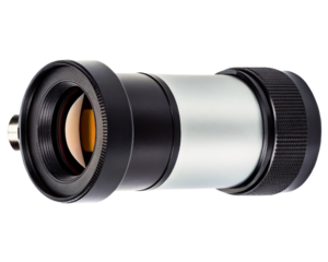 High-power astronomy telescope eyepiece with coated lens optics on a transparent background