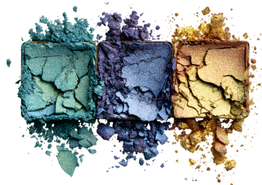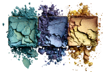 Three colorful eyeshadow palettes with glitter isolated on a transparent background