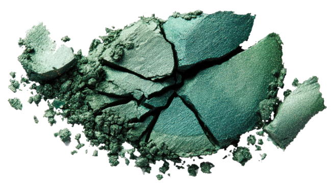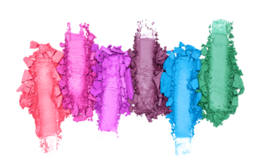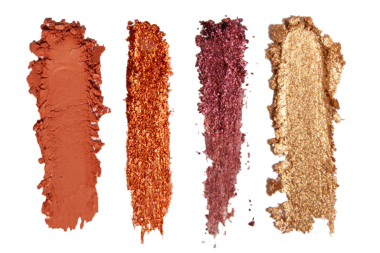 Broken and smashed color make-up eyeshadow palette, lay of brush strokes, on transparent background, top view. Sample cosmetics concept