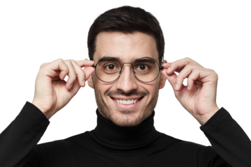 Serious man with glasses adjusting frames portrait close-up transparent background