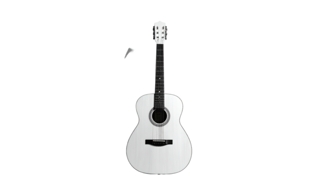 A light-colored acoustic guitar on a black background, showing its strings and fretboard