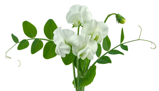 White sweet pea flowers with green leaves and tendrils, isolated on black background