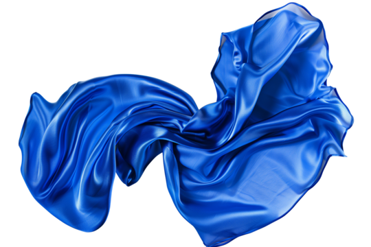 A piece of royal blue silk cloth, gracefully cascading and folding in mid-air, isolated on transparent background.