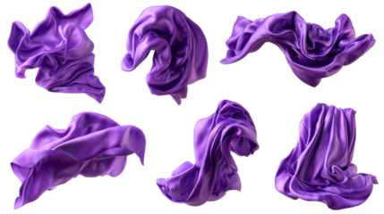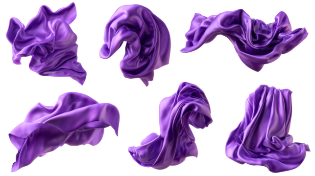 Six purple silk fabric swatches dynamically flowing and folding on white background