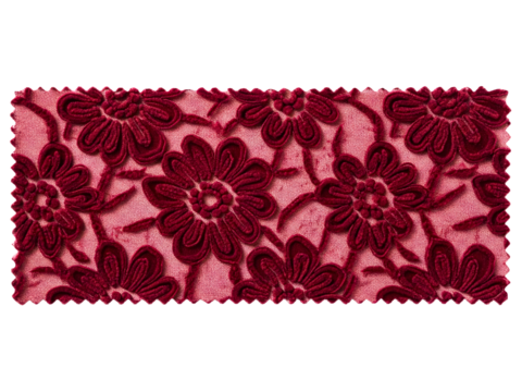 Swatch of dark red lace fabric with an embroidered flower pattern on a transparent background
