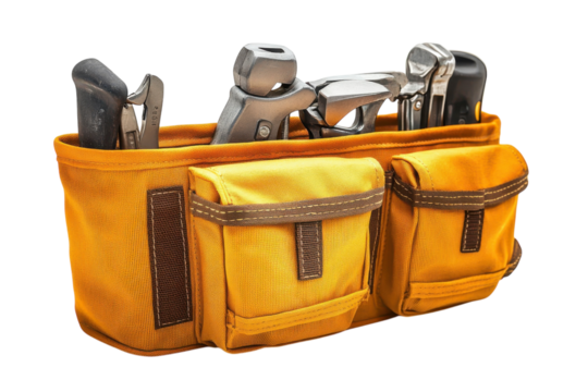 Heavy Duty Yellow Tool Belt with Wrenches Pliers Contractor Electrician Carpenter Tools on transparent background