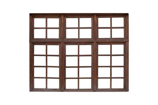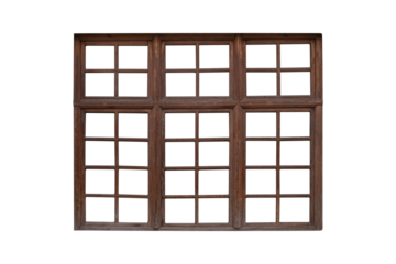 Large brown wooden window frame with multiple sashes is isolated.