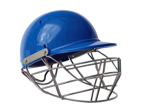 Blue cricket helmet with metal face guard, isolated on transparent background