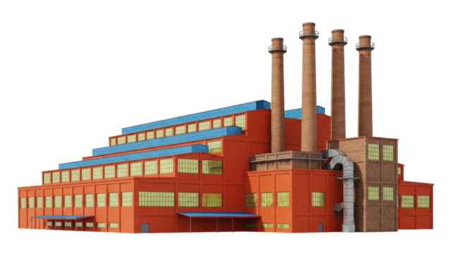 Abandoned old brick factory building with smokestacks isolated on transparent background