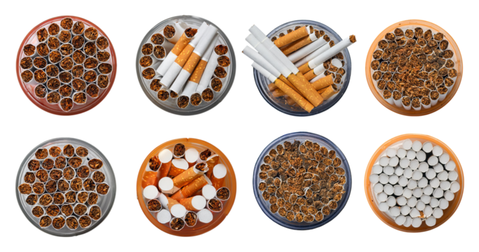 Various Arrangements of Cigarettes and Ashtray with Tobacco, isolated on transparent background