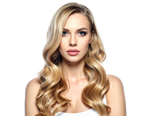 Long, wavy blond hair with highlights is flowing freely, giving a sense of movement and dynamism, isolated on a transparent background, perfect for beauty and hair care projects