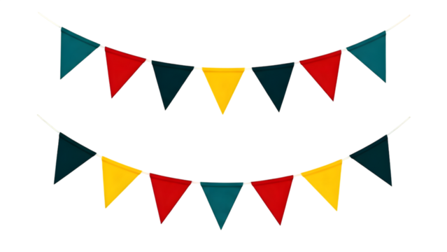 Two strings of colorful triangular bunting flags in red, yellow, and teal, hanging festively against a white background.