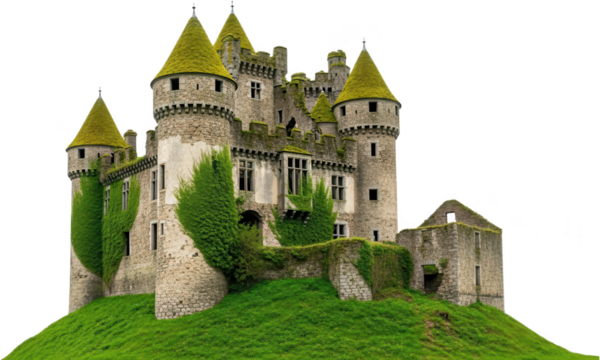 A majestic ancient stone castle with moss covered conical roofs and ivy climbing its walls set atop a lush green hill fortress medieval architecture fantasy history towers transparent background