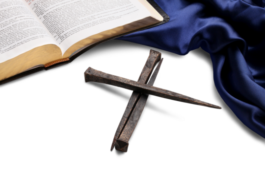 Сrucifixion Spikes with nails in shape Of Cross On the Bible
