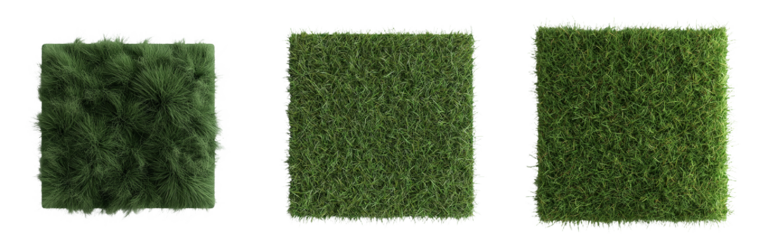 Square patch of lush green artificial turf on PNG cutout transparent background.