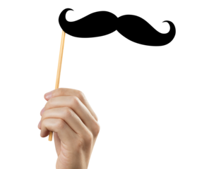 Hand holding moustache on a stick, cut out