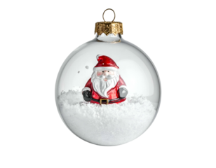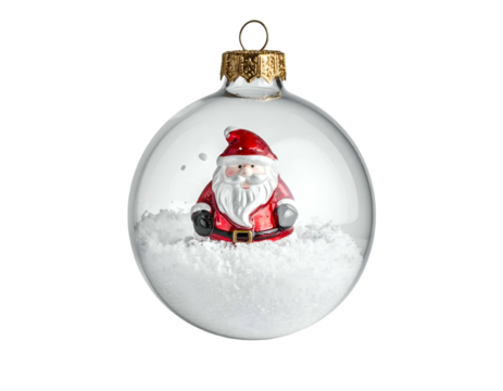 Glass orb with Santa Claus figurine nestled in artificial snow