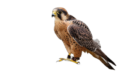 Peregrine falcon flying PNG isolated on transparent background, bird of prey with patterned wings for wildlife and nature designs
