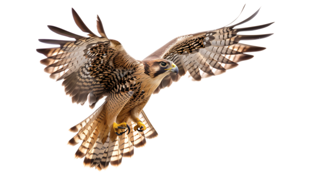 A majestic falcon soars through the air, wings spread wide in a display of freedom and power, grace and agility isolated with white background