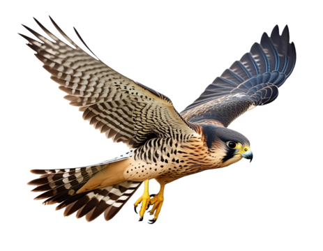 Dynamic image of a peregrine falcon in flight, isolated against a white background