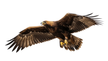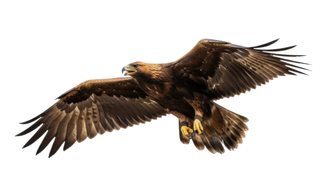 Isolated eagle soaring with wings spread looking down in sky, bird of prey, falconry, wild animal