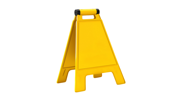 A bright yellow caution wet floor sign stands ready to prevent slips and falls in workplaces or public areas ensuring safety.